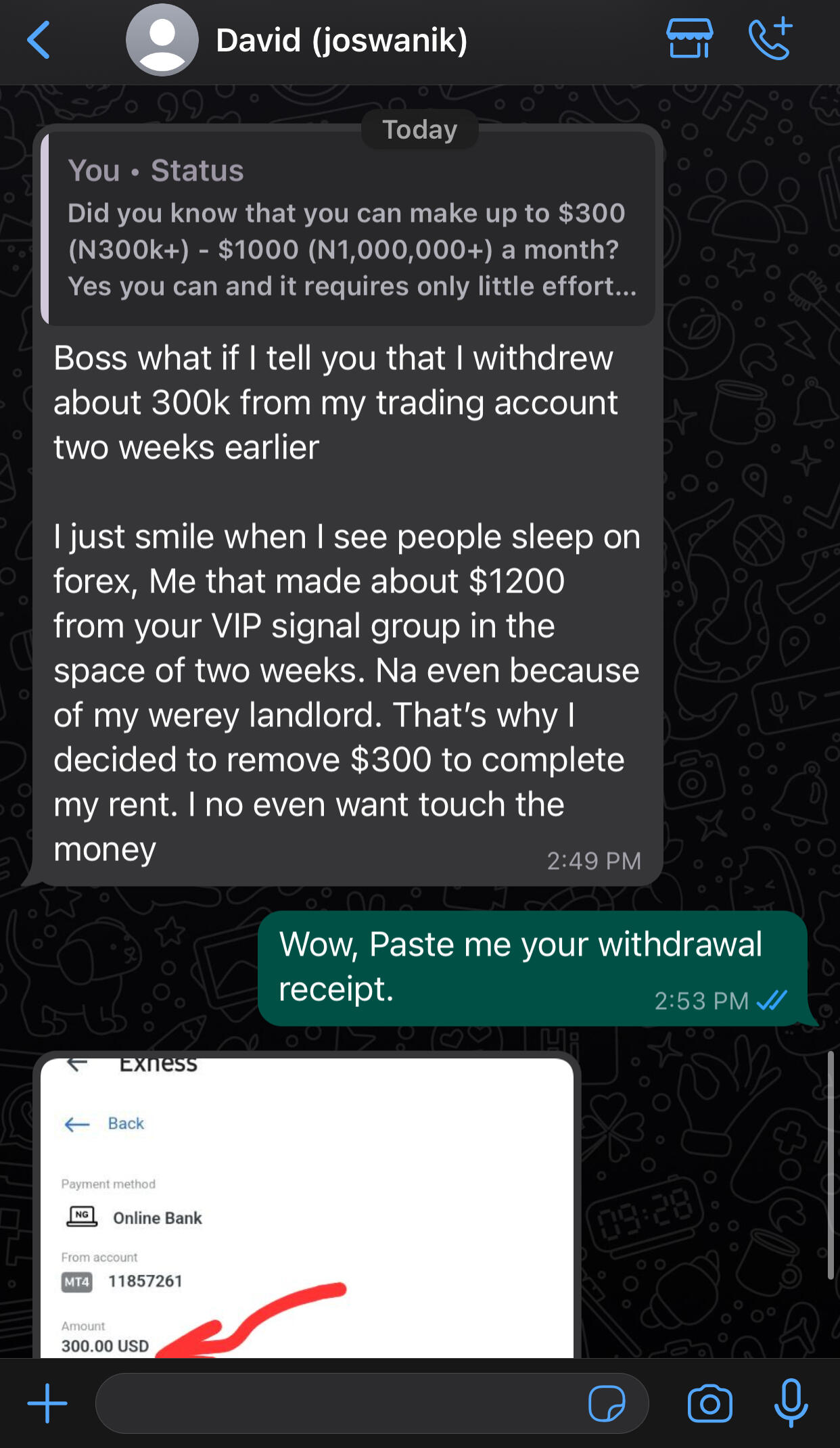 👇Meet David, who made $1200 and withdrew $300 to settle his house rent bill